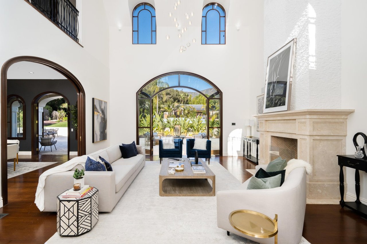 This spectacular Mediterranean style villa with interior contemporary elements will transport you to another time and place. Upon entering the foyer, you are greeted by ascending ceilings, and beautiful Palladian windows highlighting unobstructed mountain views. A floor to ceiling fireplace in the living room is a great statement piece and compliments the grand staircase. This home not only boasts a pool/hot tub, but tucked away behind the guest house is yet another spa area including an outdoor shower, cold plunge, and soaking tub.